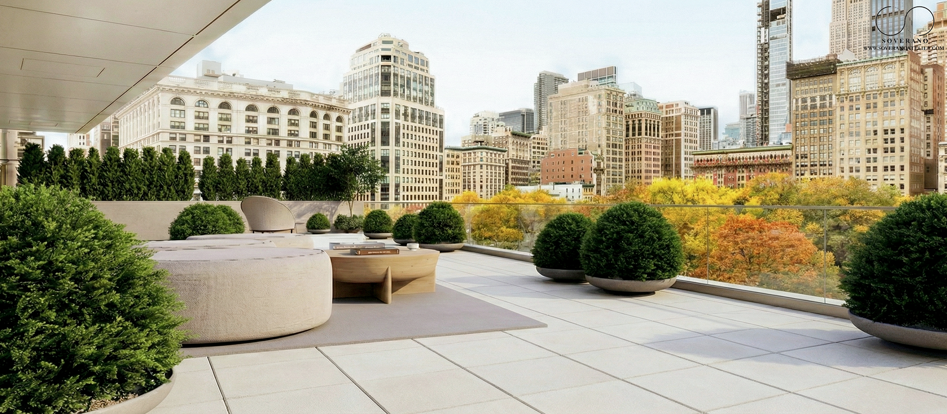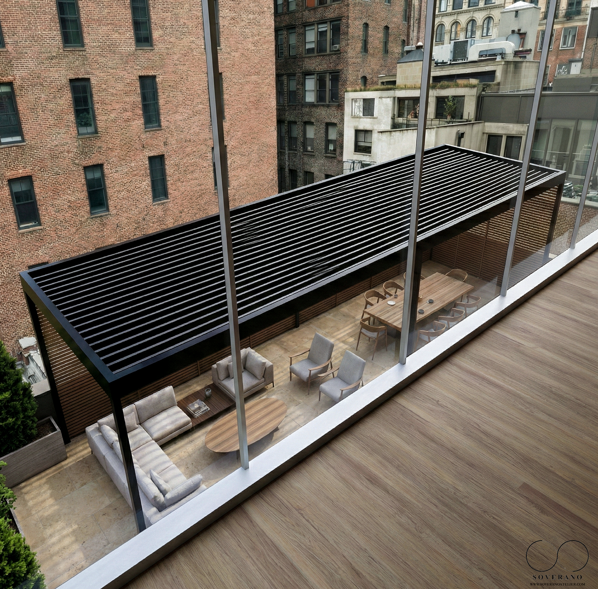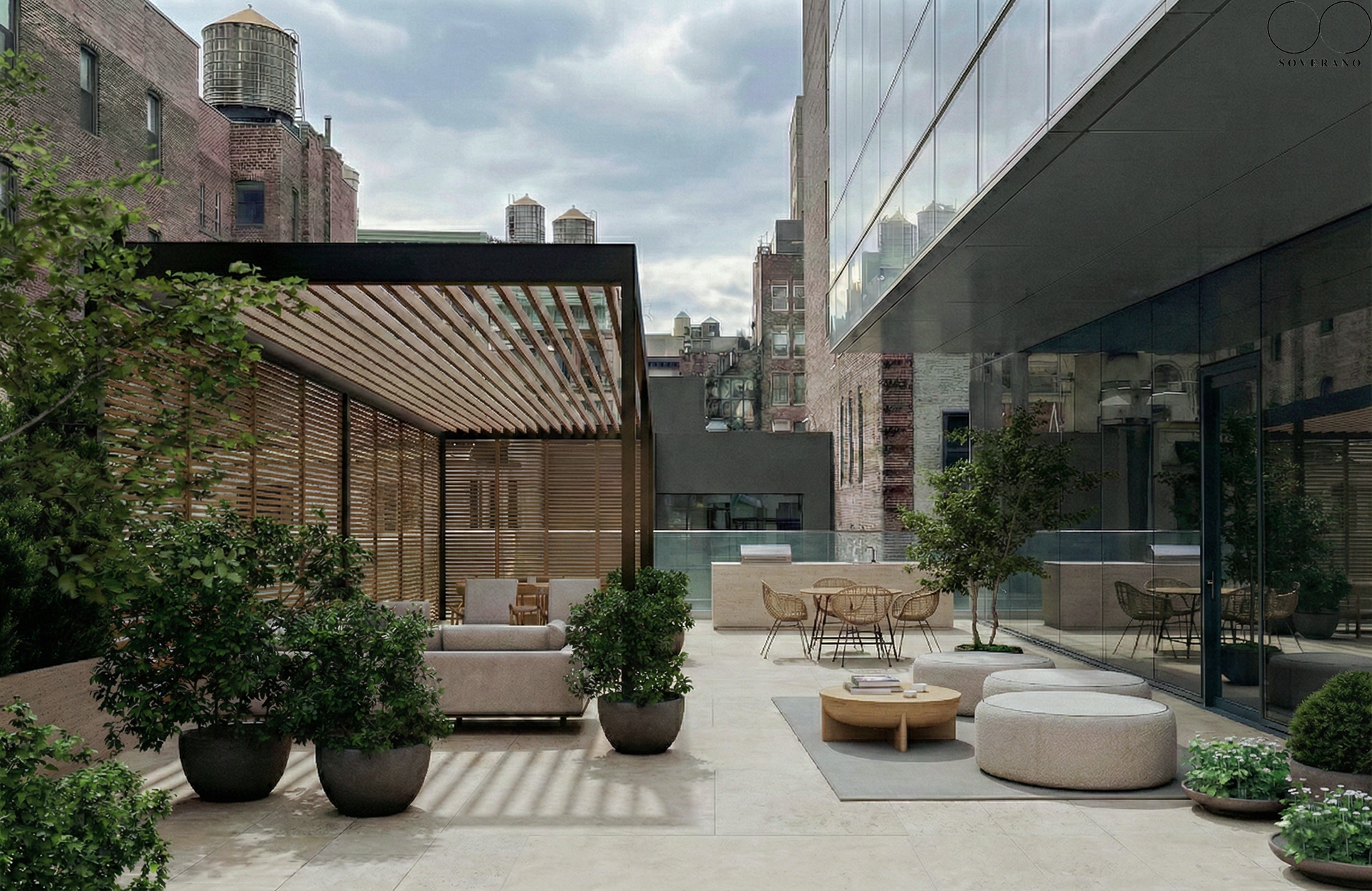This space is a sanctuary of tranquility and leisure, seamlessly integrating multiple areas for relaxation and entertainment. A sleek pool shimmers under the sun, while a modern pergola casts gentle shadows, creating a perfect spot to unwind. With its vibrant plant life and thoughtful layout, the terrace becomes a living canvas, where the elements of earth, water, and light come together to inspire moments of serenity and connection.